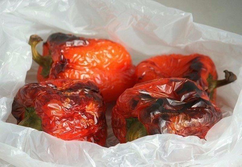 Затем перцы осторожно сложите в пакет, плотно завяжите его и вынесите на холод на полчаса. После этого очистите перцы. Сначала выньте черенок с внутренностями, держа перец вертикально, чтобы не вытек сок. Можно около черенка немного надрезать. Затем сок слейте в отдельную посуду, снимите кожицу и уберите оставшиеся семечки.
