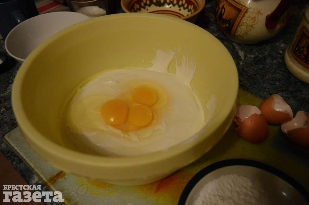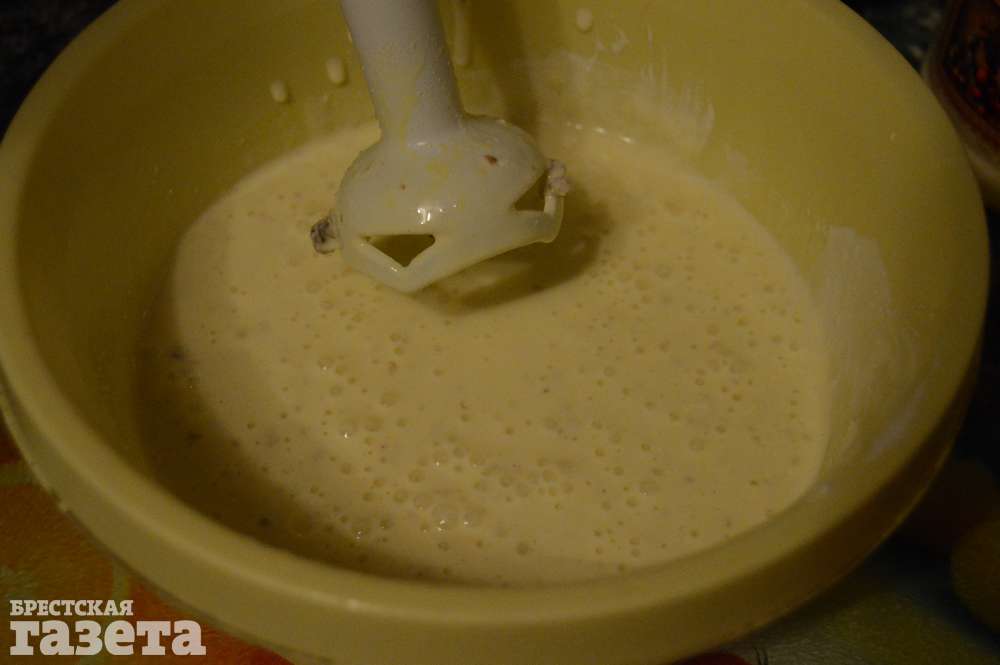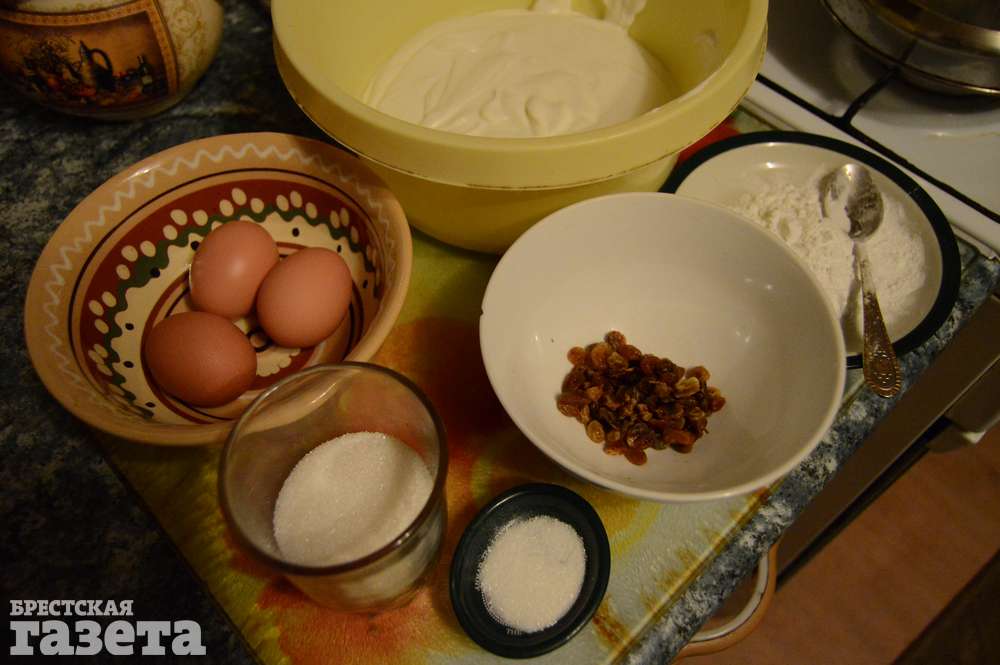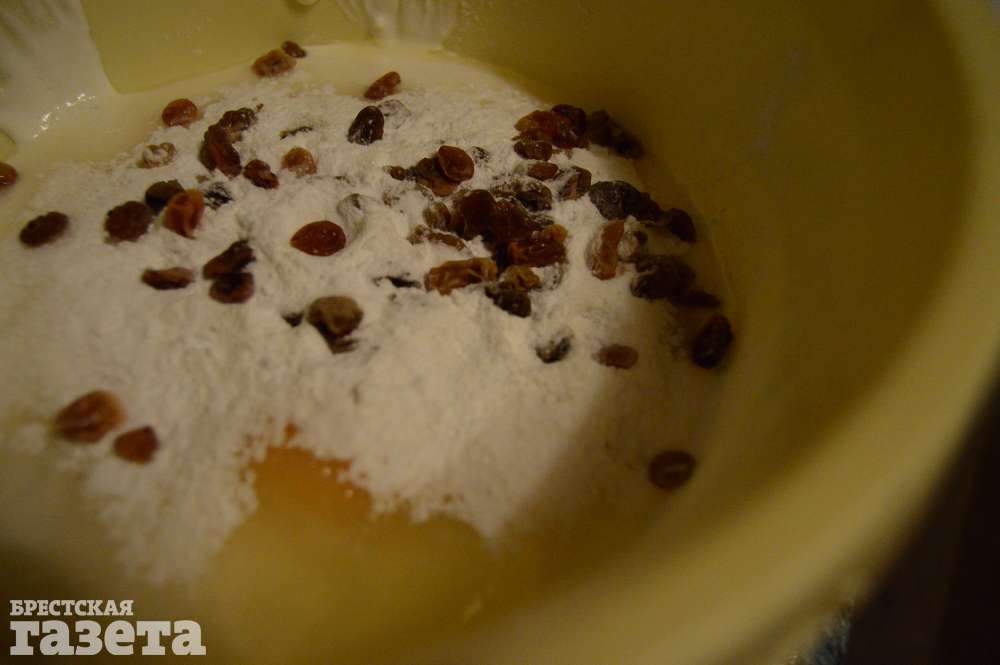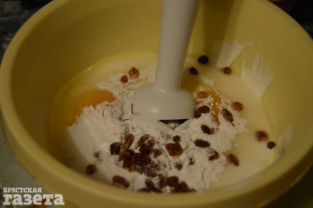 Готовим: Изюм предварительно замочите в горячей воде. В миску выложите творог и разбейте в него яйца. Затем введите туда сахар, крахмал и ванилин. В последнюю очередь добавьте изюм. Взбейте творожное тесто блендером или миксером до однородности. Вылейте в силиконовую форму для выпечки.