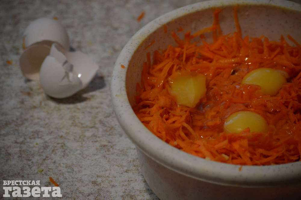 Готовим: Морковь очистите и натрите на крупной терке. У лимона натрите цедру и выжмите сок. Добавьте их к моркови. Затем в миску к моркови разбейте яйца, всыпьте корицу, соду, гашенную уксусом, и мед. Добавьте манку, все хорошо перемешайте и оставьте на полчаса, чтобы манка разбухла.