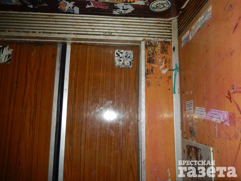 С Владимиром и Надеждой Жесько, которая также живет в этом доме, на лифте мы поднялись на девятый этаж. Кабина лифта в плачевном состоянии, исписана, а во время подъема раскачивается.
