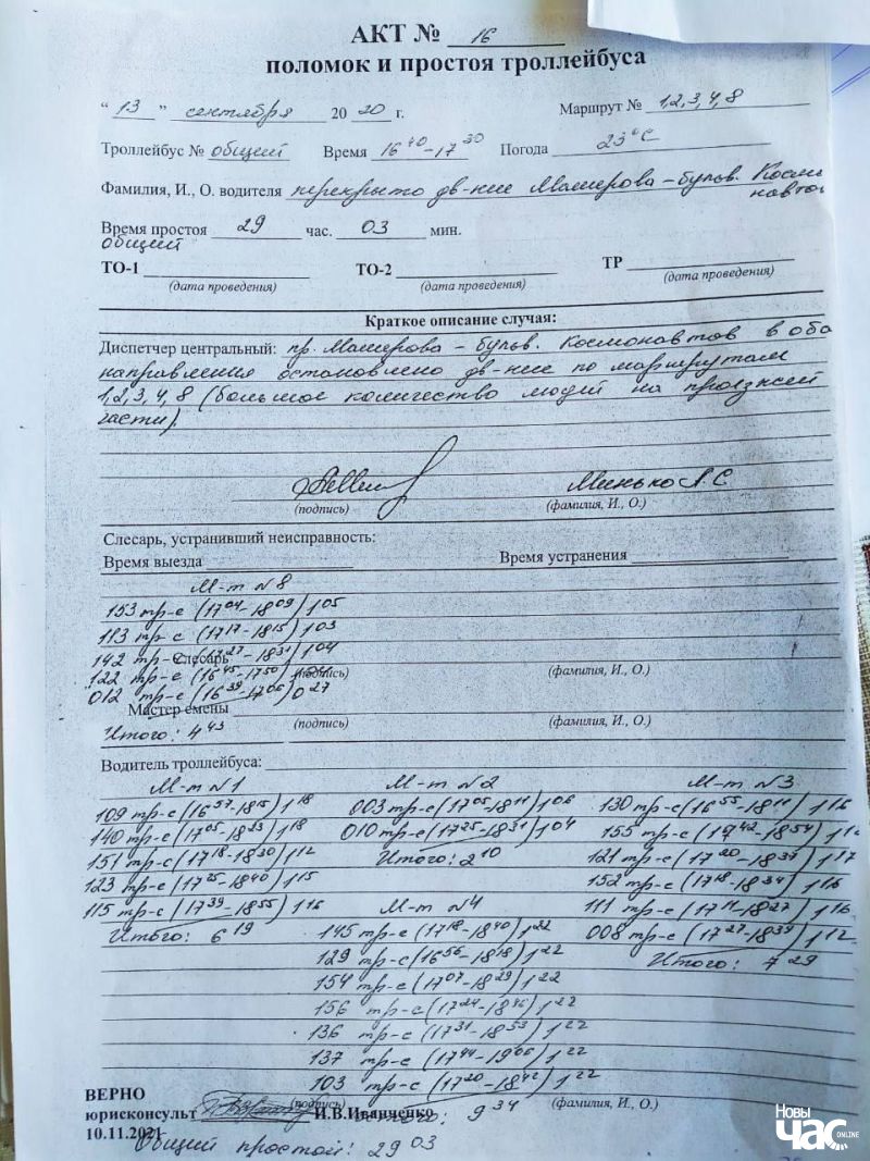 Чатыры разы я заяўляла хадайніцтвы аб тым, каб запатрабаваць у тралейбуснага парку акты прастою, і чатыры разы атрымлівала ад суда адмову. Гэта было важна, бо ў вышэйзгаданы разлік уключылі прастой па 25 тралейбусах, але людзі знаходзіліся на скрыжаванні — і гэта пацвярджаецца відэа — усяго толькі паўгадзіны: з 16 гадзін 41 хвіліны да 17.11. Адкуль узяліся 25 тралейбусаў з недапрабегам 495 кіламетраў? Калі праз адвакацкую кантору, ужо пасля вынясення прысуду, я ўсё ж атрымала акт прастою, аказалася, што з 25-ці ўзгаданых тралейбусаў 19 выязджалі ў наш бок ужо пасля таго, як удзельнікі акцыі сышлі са скрыжавання і рух транспарту быў адноўлены, то-бок пасля 17 гадзін 11 хвілін.