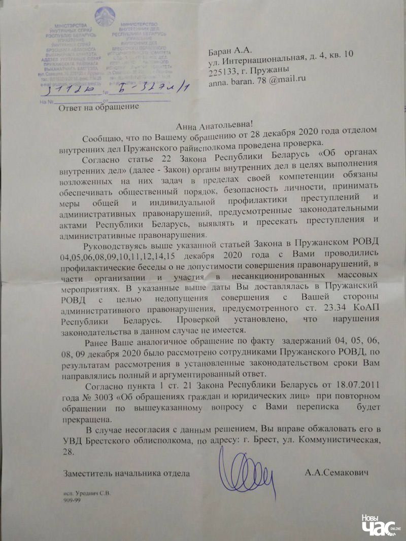 З гэтай нагоды я напісала скаргу на шэсць старонак, дзе падрабязна пералічыла, якія нормы закона былі парушаны службоўцамі — і Канстытуцыя, і закон аб працы органаў унутраных спраў, адпаведная дырэктыва, дзе напісана, што «кіраўнік дзяржаўных органаў, у тым ліку пракуратуры, органаў унутраных спраў абавязаны прымаць грамадзян у межах часу, неабходнага для выканання працэсуальных працэдур». То-бок я павінна чакаць толькі час, колькі аб’ектыўна мусіць ажыццяўляцца працэсуальнае дзеянне. На сваю скаргу я, вядома, атрымала звычайную адпіску.