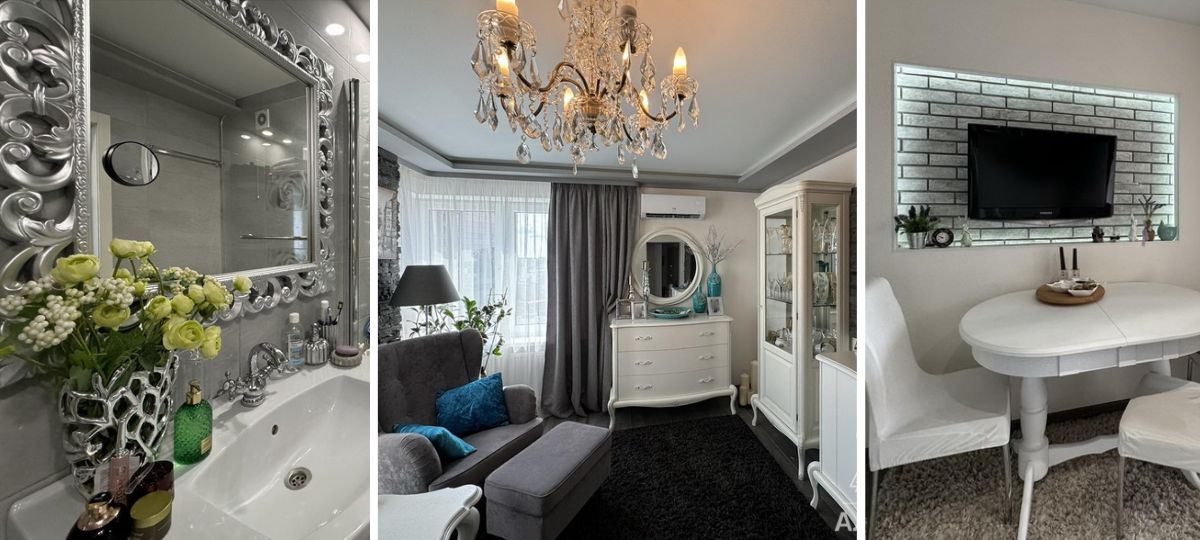 Стильная «однушка» расположена на шестом этаже 16-этажного монолитного дома 2016 года постройки в центре города. Ее интерьер в благородной серо-белой гамме привлекает внимание деталями. Будь то бархатные подушки, мебель на изогнутых ножках или зеркала в тяжелых рамах с вензелями. Повсюду чувствуется бохо-шик. Общая площадь квартиры составляет 40,3 кв. м.