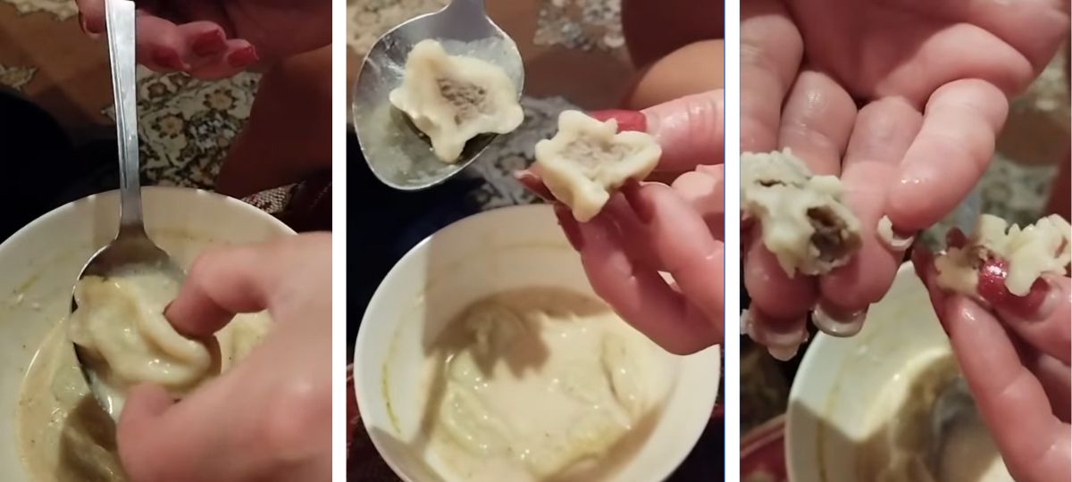 «Пельмени от “Бабушка Аня”. Смотрите — красивый пельмень на ложке. Делим пополам… тесто, тесто, тесто. Мясо наконец-то нашла!» — с иронией комментирует автор видео.