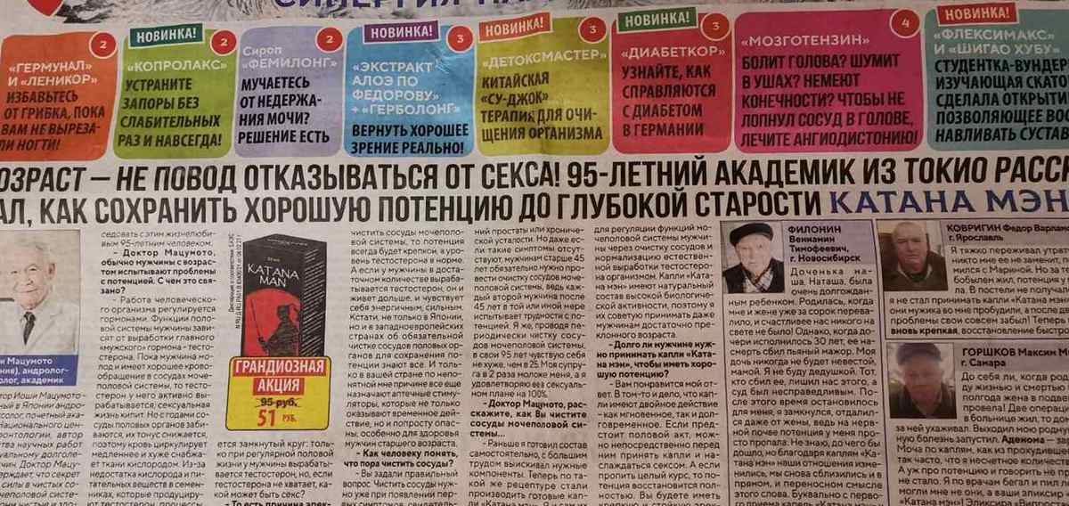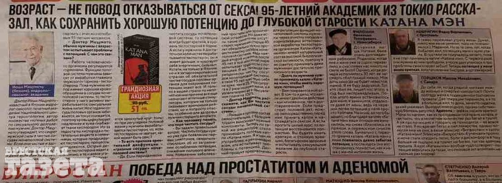 Газетенка называется «Целебникъ» – с твердым знаком на конце. Она открывается рекламой препарата «Katana Man». Чтобы убедить в его эффективности, в том, что он помогает «сохранить потенцию до глубокой старости», авторы «взяли интервью» у японского андролога-сексолага. Для пущей убедительности даже его фотография прилагается.