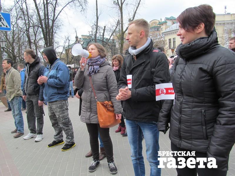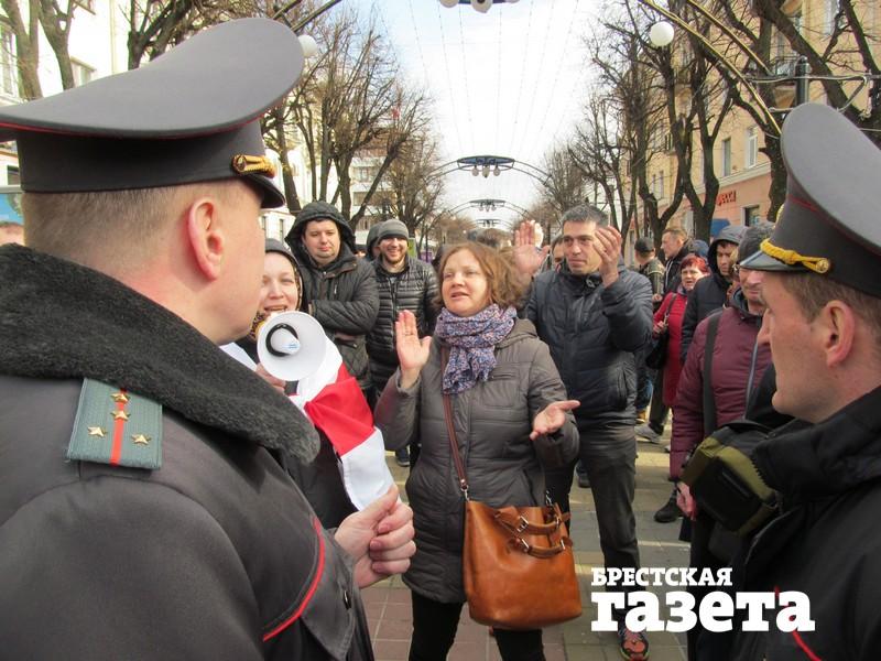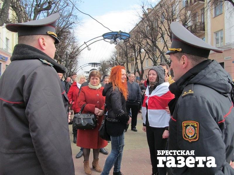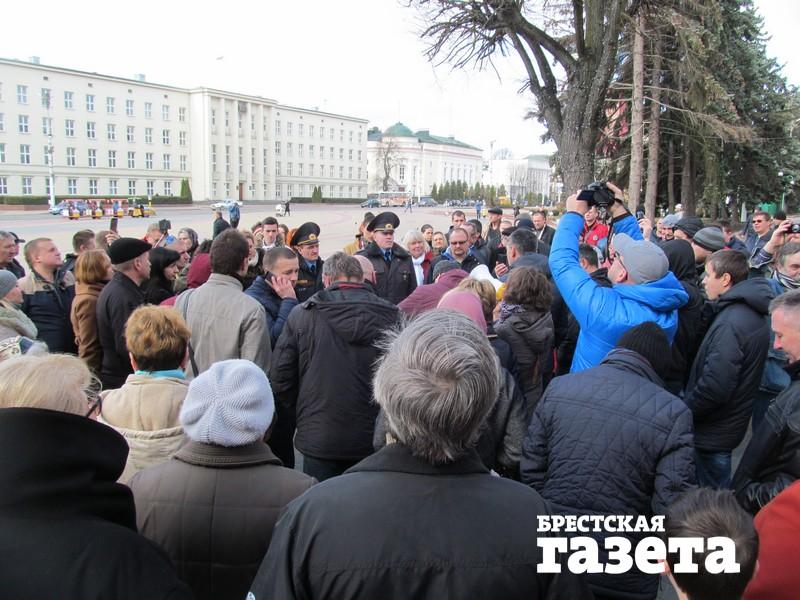 Полина Шарендо-Панасюк через мегафон призывает людей на площадь. Вокруг нее собрались люди. Она говорит, что основная акция состоится 25 марта в Минске на День Воли. Подошла милиция. Люди защищают ее. Наряд предупреждает об административной ответственности.