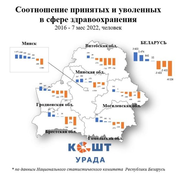 По регионам ситуация разная. В Минске, который обслуживает интересы большинства чиновников, баланс принятых на работу/уволенных медиков уходил в «минус» только в 2021 году. Об итогах 2022-го говорить пока рано. Тем не менее, в столице за период с 2016 по июль 2022-го наблюдается рост на 1 290 человек. Все остальные области за тот же период показывают отрицательный результат.