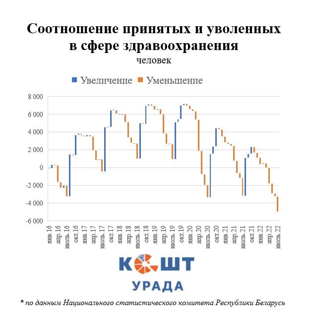 В 2017 году в отрасли было нанято на работу на 2 474 человека больше, чем уволено, в 2018 — уже на 842, а в 2019 — всего на 12. После этого начался отток. В 2020-ом году из медицины ушло на 3 422 человека больше, чем пришло, в 2021-ом «минус» составил 2 412 году, а в 2022-м по состоянию на июль из медицины уволилось на 6 126 человек больше, чем пришло в сферу (ситуация еще сгладится сезонным осенним притоком).