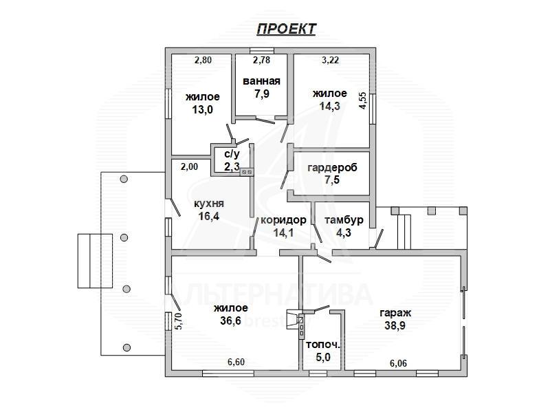 Общая площадь — 74,5 кв.м, жилая — 35,7 кв.м. В доме три изолированные жилые комнаты, самая просторная площадью 17,88 кв.м. находится в глубине дома, проходная кухня — 8,32 кв.м, вспомогательные помещения расположены у входа в дом. Плюсом являются высокие потолки 2,8 м. Однако дому требуется ремонт.