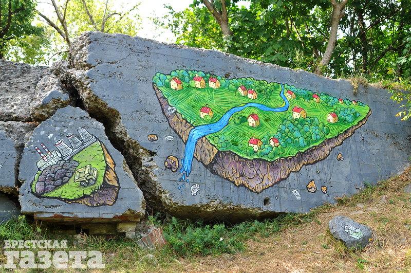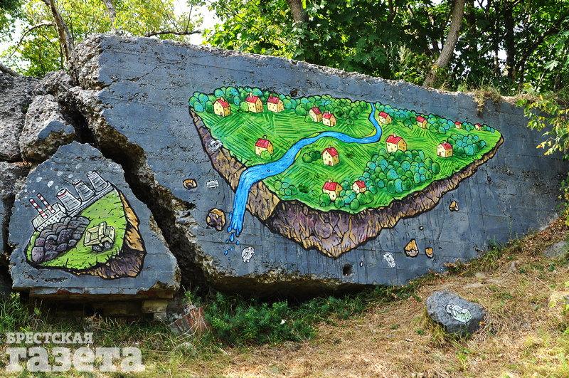 Уличный художник Предок разрисовал новый объект на Форте IV. На основной части изображена деревня с зелеными полями и полноводной рекой. От нее «отколота» атомная станция.