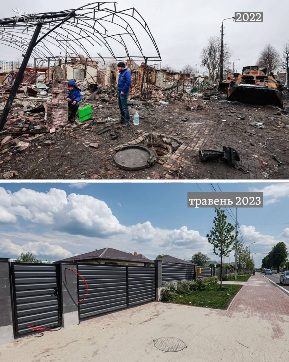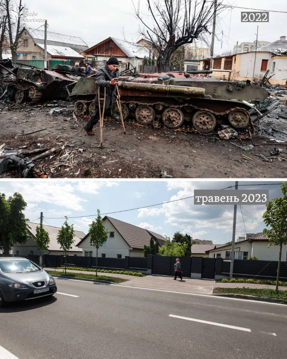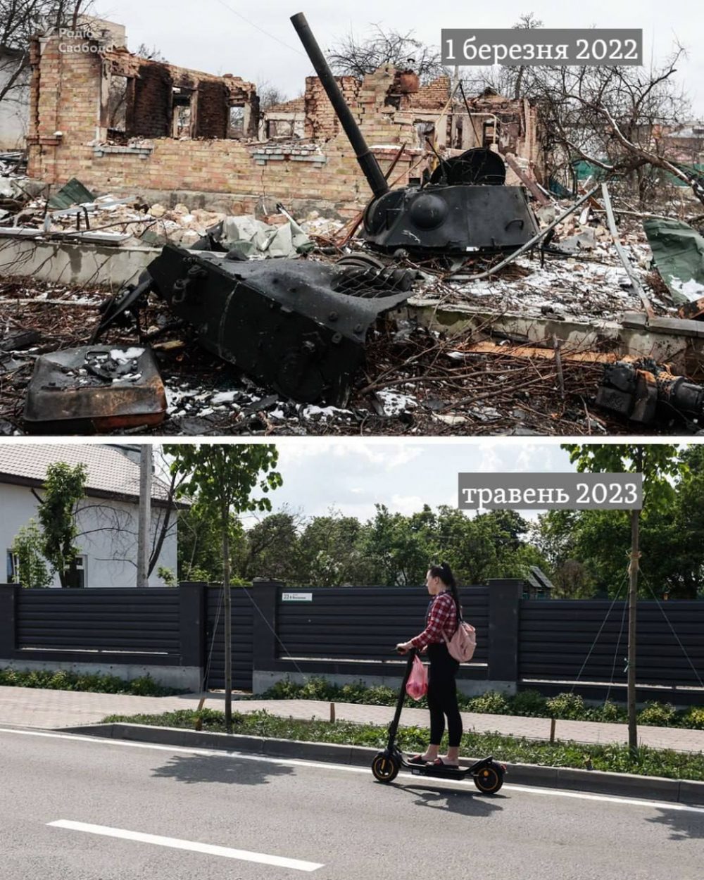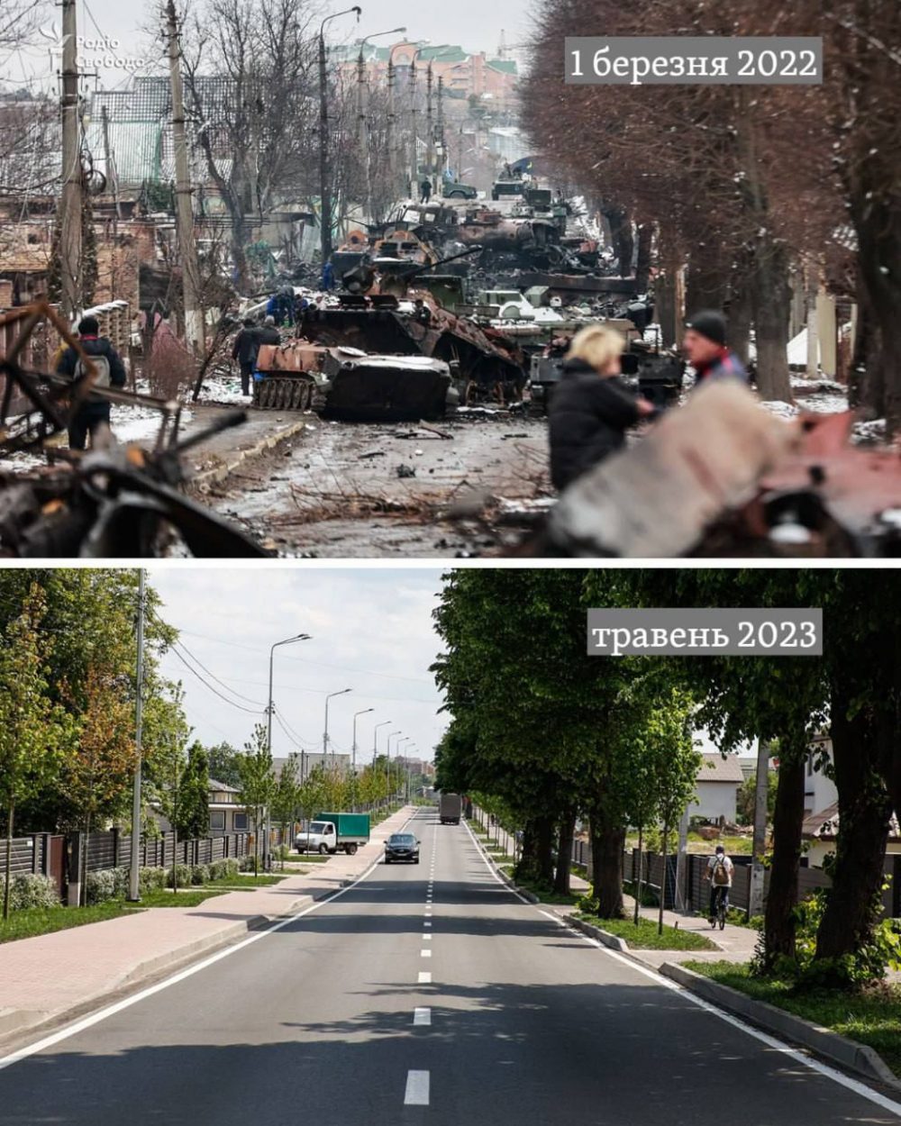 Одна из центральных улиц города 1 марта 2022 и новое шоссе в мае 2023 года (снизу).По официальным данным, более 2,5 тысяч сооружений повредили российские оккупанты в Буче. В общей сложности ущерб города составляет более 5 миллиардов гривен. В сентябре прошлого года городской голова Анатолий Федорук сообщал, что в городе снесут 372 частных дома и два многоэтажных. Они не подлежат восстановлению.1 марта 2022 года. Буча, улица Вокзальная. Именно по ней тридцатикилометровая колонна российской техники шла через весь город в Ирпень, а оттуда планировала идти в Киев, чтобы взять его за 3 дня. Снизу улица Вокзальная в Буче в мае 2023 года.Тогда этой колонне помешали добровольцы из Бучи, впоследствии ее уничтожили Вооруженные силы Украины.