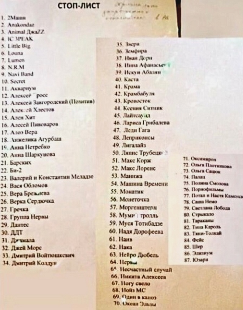 С начала этого года в Беларуси запрещено проведение культурно-зрелищных мероприятий с участием артистов из утвержденного в КГБ списка. В нем 87 фамилий. Если в каком-либо заведении будет звучать запрещенная песня, организаторов мероприятия могут оштрафовать «за отступление от гастрольного удостоверения». Если же заранее вписать в гастрольное удостоверение запрещенную песню, такое мероприятие не разрешат.