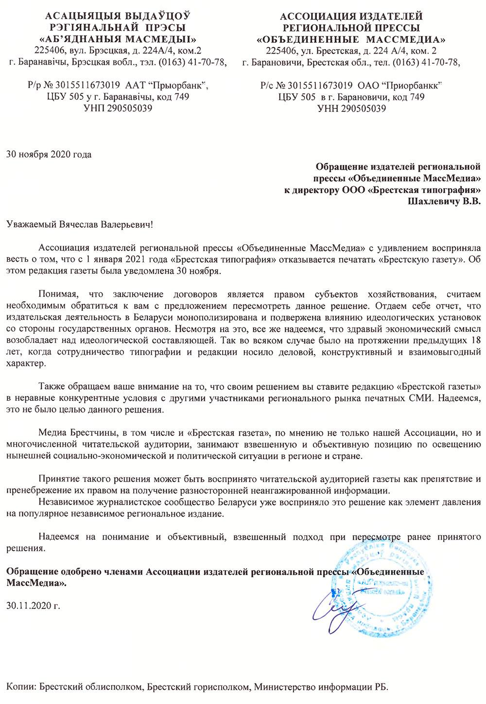 Ассоциация издателей региональной прессы «Объединенные МассМедиа» с удивлением восприняла весть о том, что с 1 января 2021 года ОАО «Брестская типография» отказывается печатать «Брестскую газету». Об этом редакция газеты была уведомлена 30 ноября.