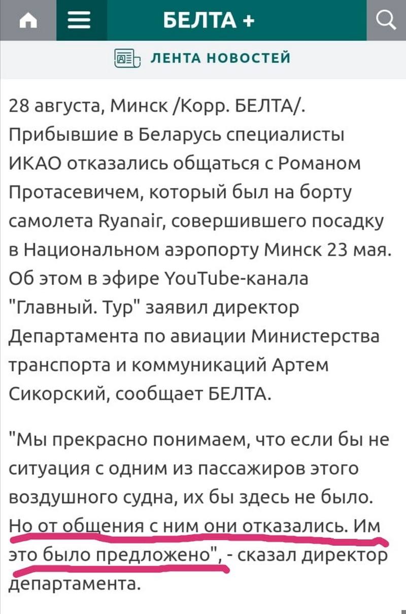 Далее БЕЛТА пишет: более того, в плане пребывания в Беларуси специалистов ИКАО изначально было отмечено, что они хотят пообщаться со всеми пятью пассажирами, которые остались в стране после посадки самолета. «По итогу они не встретились ни с одним из них», – сказал Артем Сикорский.