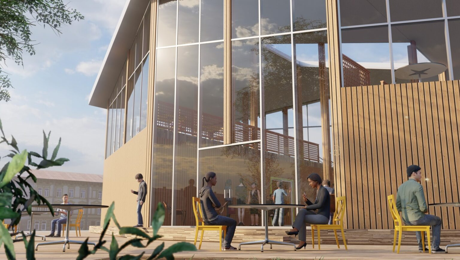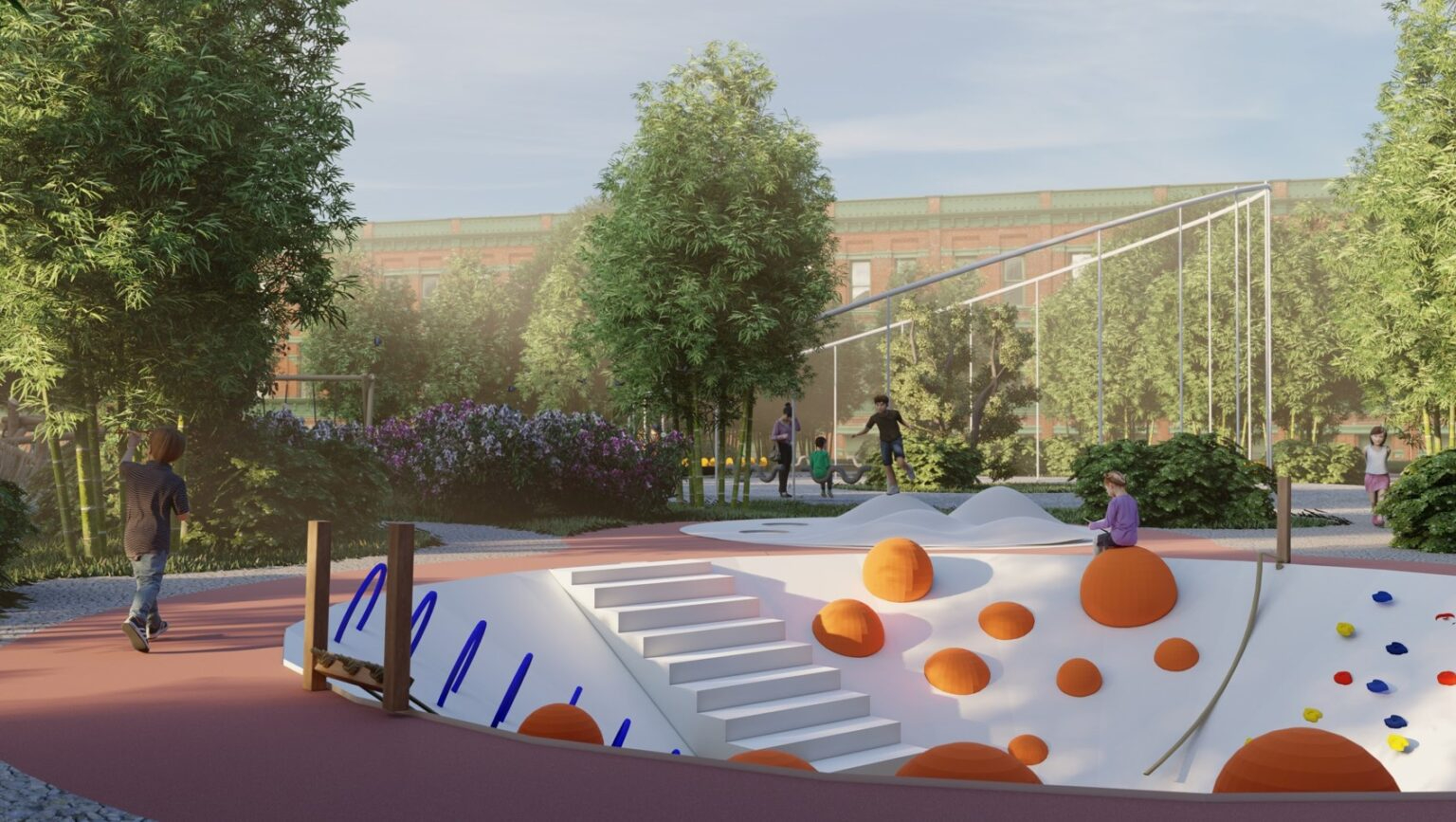 В проекте «Полесский сквер» конкурсанты предложили максимально сохранить существующее озеленение и создать комплексную благоустроенную среду для отдыха, спорта и социального взаимодействия. Для этого ребята разработали следующие зоны: галерея под открытым небом, зона с гамаками, коворкинг, кафе с летней верандой, водная зона, детская и спортивная площадки.