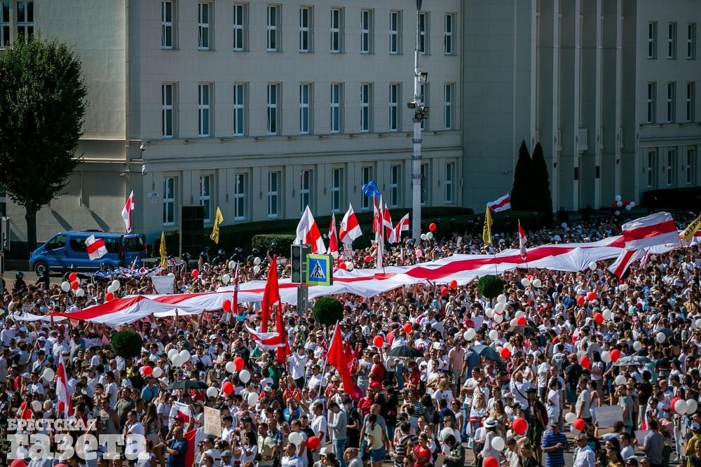 Когда после трех дней неоправданного насилия силовики на какое-то время уступили улицы белорусских городов мирным протестующим, они стали буквально красно-белыми: национальные флаги и флажки, маленькие и стометровые полотнища заполонили всё. Более того, многие участники акций протеста старались одеваться в одежду в цветах национального флага – благо, было тепло.