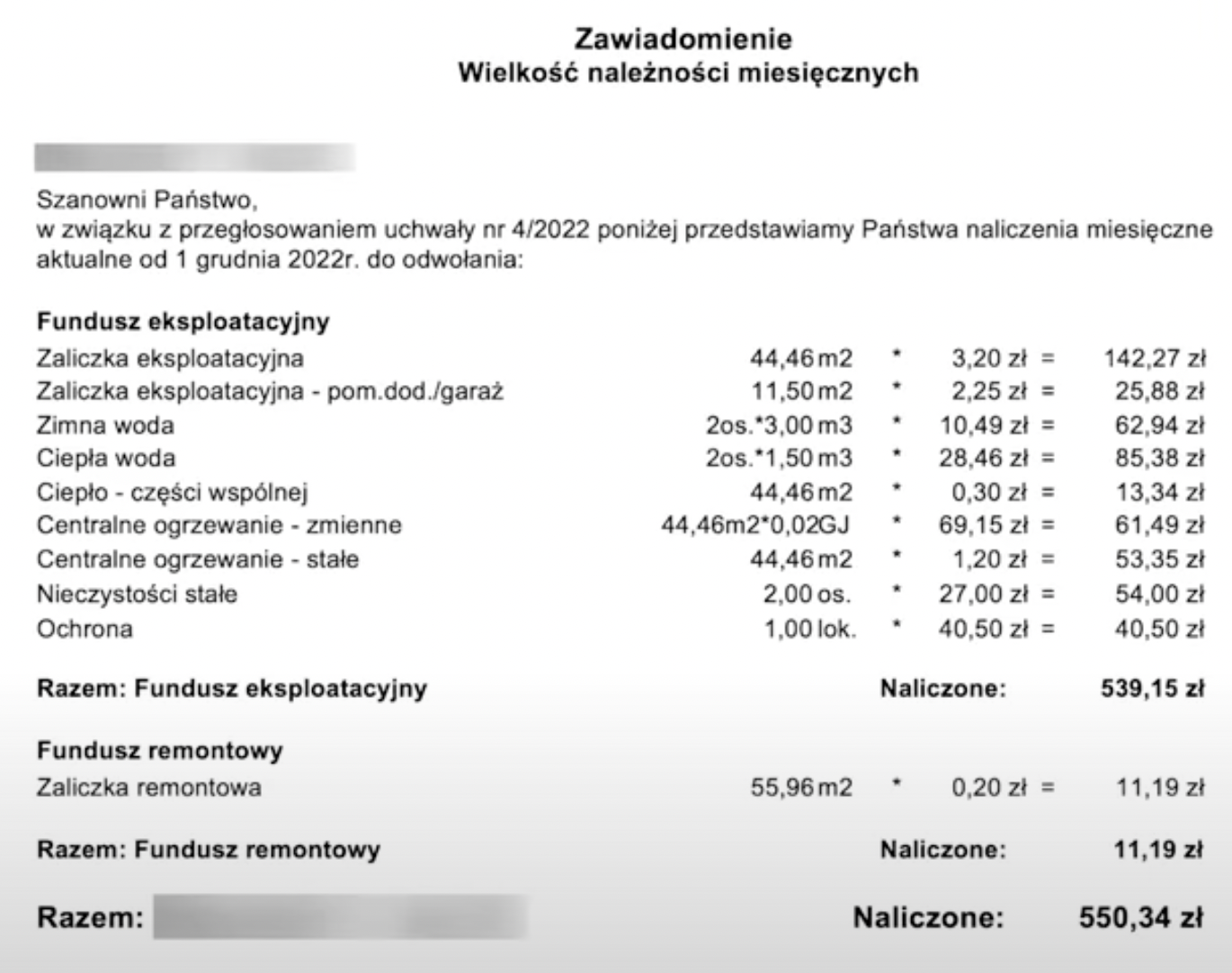 Итоговая сумма его платежки за декабрь – 550,23 злотых (312,6 беларуских рублей). Большая часть «жировки» – это оплата за эксплуатационные расходы. Она идет на счет организации, которая обслуживает придомовую территорию. Отдельными пунктами в платежке стоит теплая и холодная вода, отопление, охрана, обслуживание гаражного места и так далее.