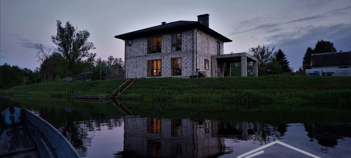 Двухэтажный дом 2015 года постройки находится в живописном месте прямо на берегу старицы (прежнее русло) Буга. На другой стороне лес, территория которого относится к природоохранной зоне. С виду дом выглядит незаконченным и будто бы в стадии строительства. Однако фотографии интерьера развенчивают эти предположения.
