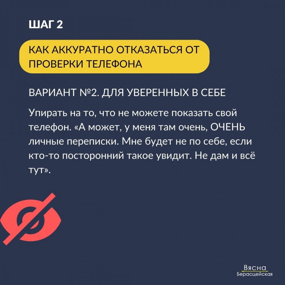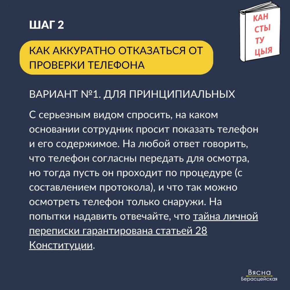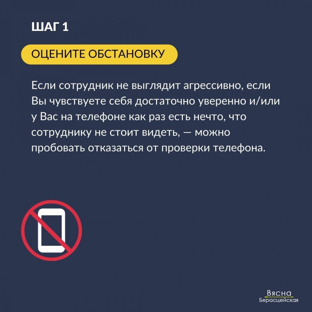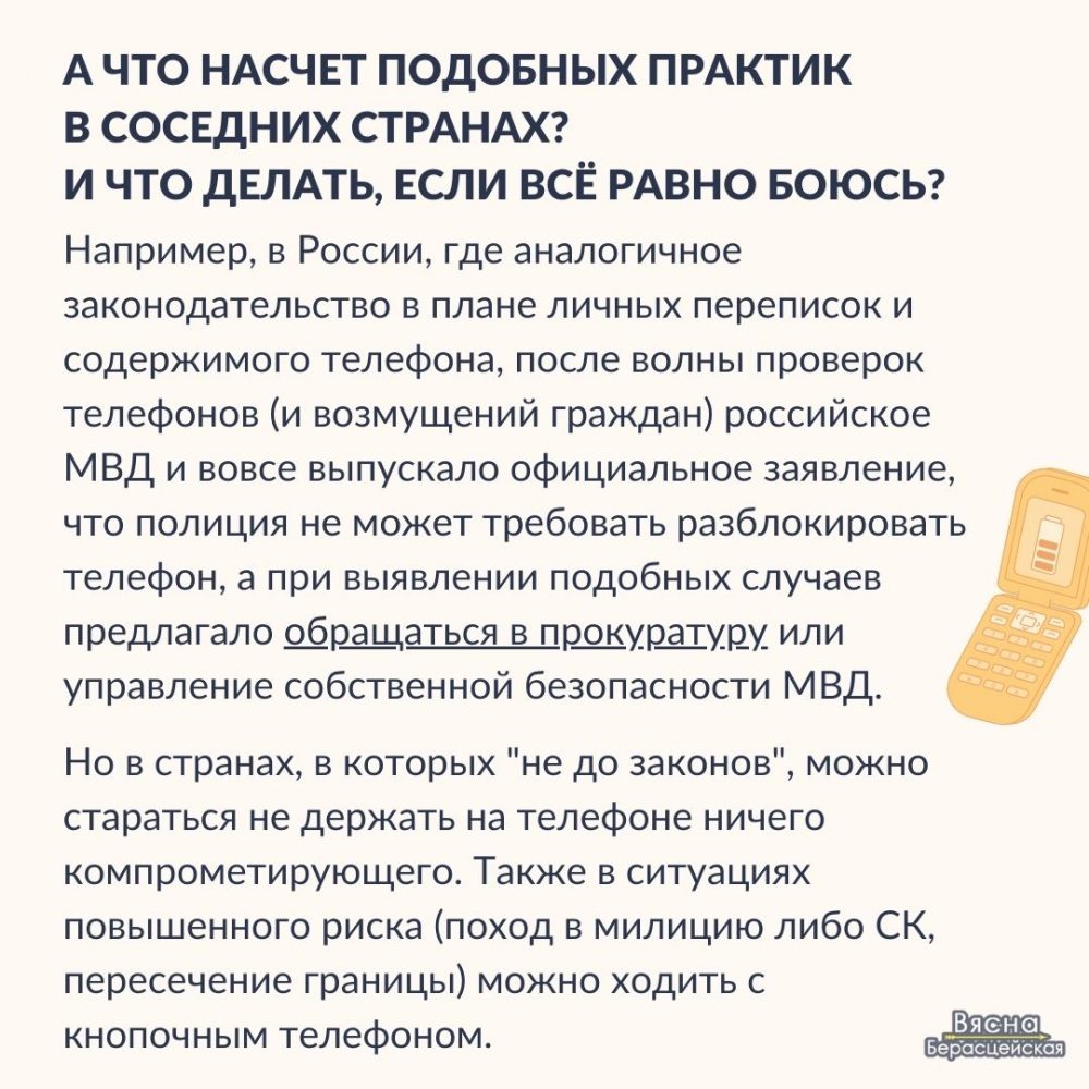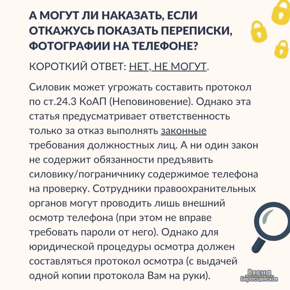 «Нам известно немало случаев, когда силовик просил разблокировать телефон и дать на проверку, человек отказывался — и… ему за это ничего не было. Нам, правозащитникам, обычно такие истории рассказывают с комментарием в духе «представьте, до чего я обнаглел, и это сработало»», — пишет брестская «Весна».