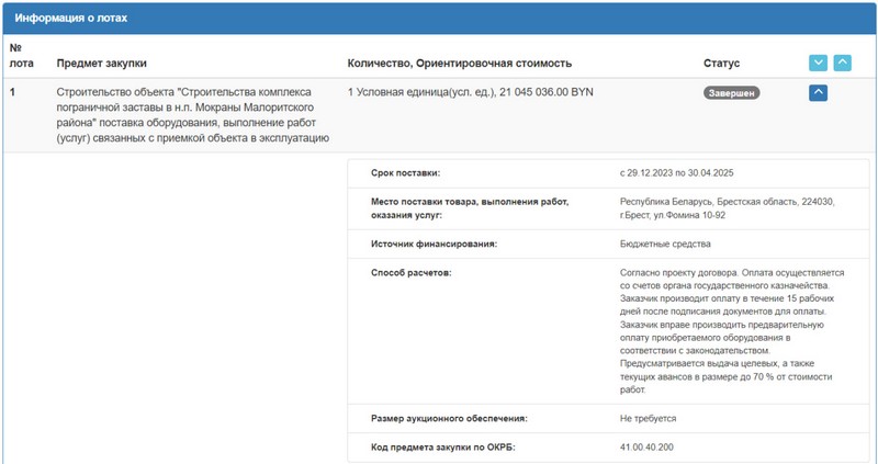 Еще один интересный момент в том, что неизвестно, когда начали строить этот объект. В одних документах на сайте госзакупок написано, что начали строить в сентябре 2023 года, в других — что в ноябре. Нет определенности со сроками строительства и датой сдачи объекта. В одних документах написано, что ее построят за 14 месяцев, в других — что за 17. В оптимистичных прогнозах ее должны открыть в январе 2025 года. Но, судя по последним тендерам на сайте госзакупок, построят погранзаставу к маю 2025-го.