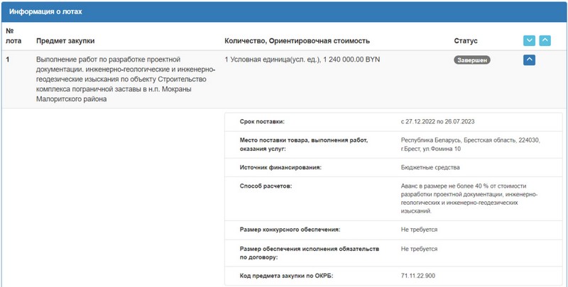После этого строительство так и не стартовало, пока председатель Госпогранкомитета 18 ноября 2022 года не утвердил задание на проектирование погранзаставы в Мокранах. Судя по тендеру на сайте госзакупок, на разработку предпроектной документации потратили 130 тысяч рублей. Сделать это нужно было до 29 декабря 2022 года. Потом появился еще один тендер, уже на 1,24 млн рублей. Эти деньги заплатили за «выполнение работ по разработке проектной документации, инженерно-геологические и инженерно-геодезические изыскания».