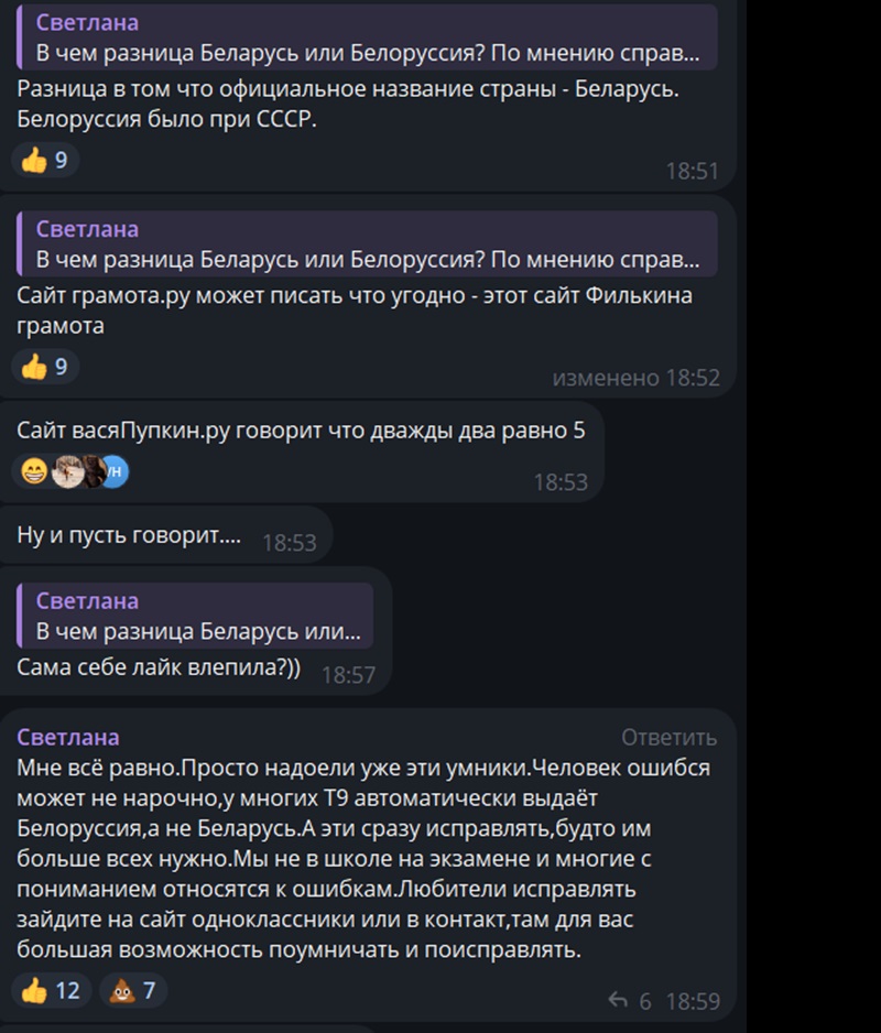 Беларусы регулярно поправляют их и учат писать Беларусь вместо «Белоруссии» или «Белоруси». Из-за этого иногда возникают споры и конфликты. Некоторые, наоборот, игнорируют вопросы россиян, если видят в сообщениях «Белоруссию». Находится место и для шуток. Ниже приводим примеры (орфография и пунктуация сообщений сохранены).