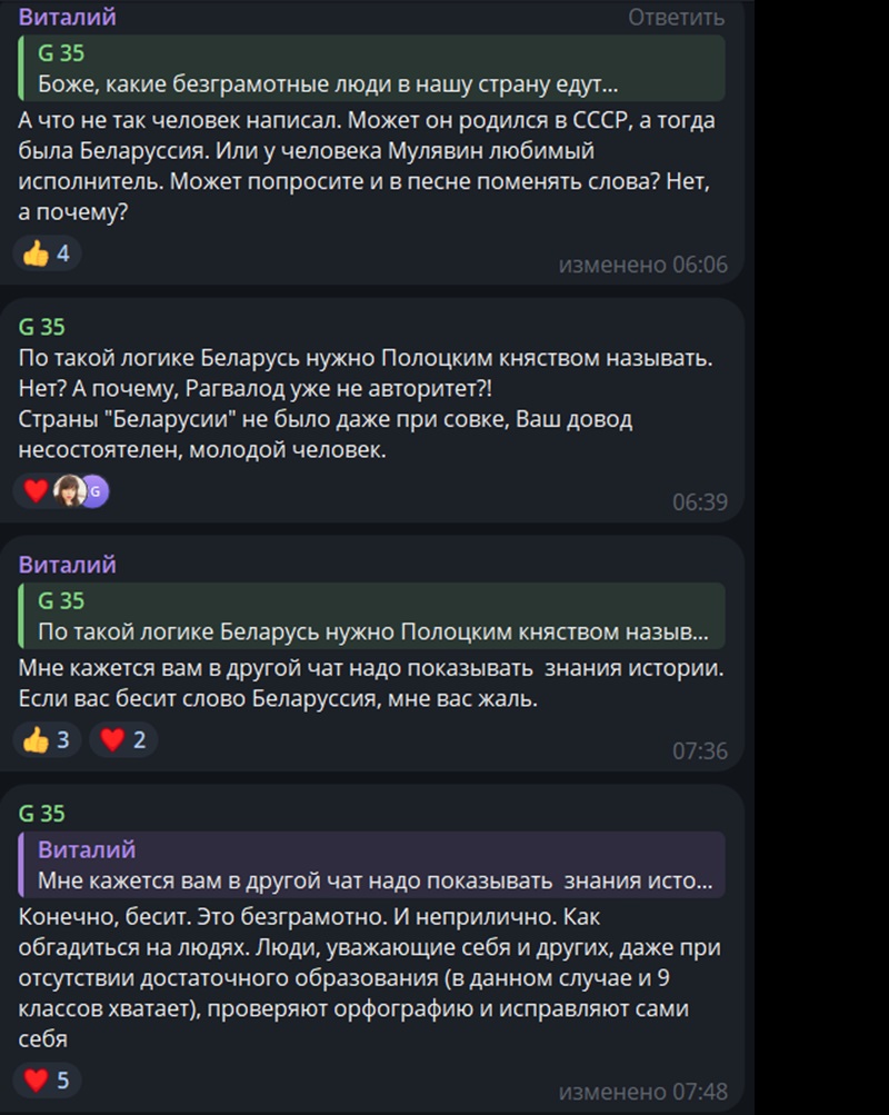 «Мне кажется вам в другой чат надо показывать знания истории. Если вас бесит слово Беларуссия, мне вас жаль».