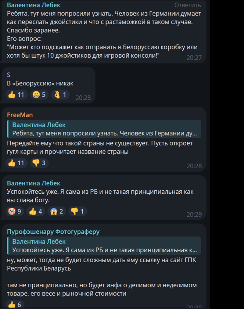 «Не умничать» — частая просьба россиян в конфликтах с беларусами. Еще один пример (ответы беларусов выделены жирным начертанием):