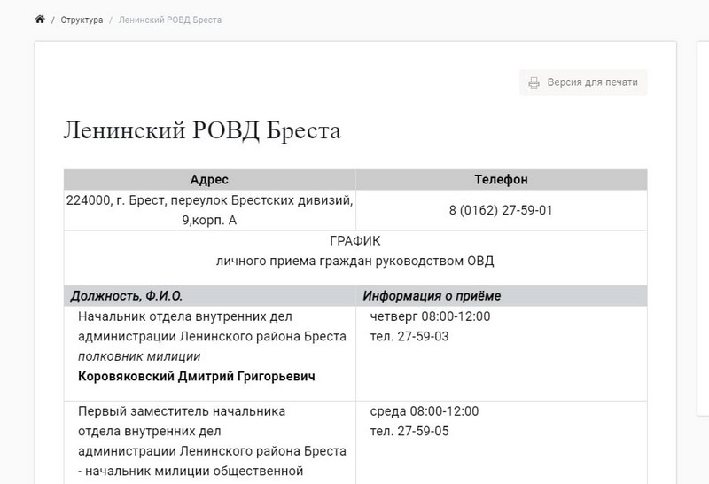 В возрасте 47 лет скоропостижно умер начальник Ленинского РОВД Бреста Дмитрий Коровяковский. Причина смерти милиционера неизвестна. Его похоронили 15 апреля, прощание с ним прошло во Дворце культуры профсоюзов в Бресте, сообщили со ссылкой на свои источники «Белсат» и «Наша Нiва». МВД, УВД Брестского облисполкома и другие ведомства молчат о смерти Коровяковского, при этом на сайте Ленинского РОВД Бреста он по-прежнему указан начальником.