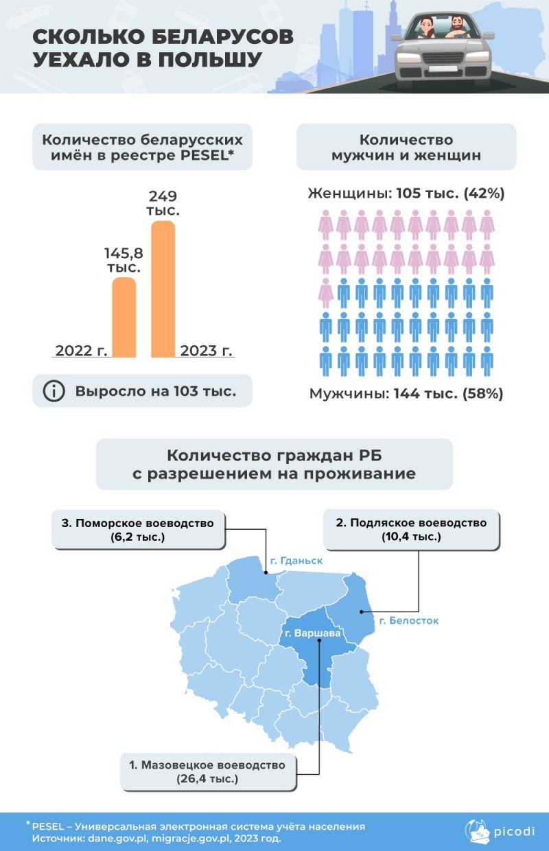 Аналитики Picodi.com повторно изучили статистику польских государственных органов и посчитали, сколько беларусов живет в Польше. Количество беларусов в Польше можно оценить примерно в 249 тысяч. По сравнению с прошлым годом их количество увеличилось на 103 тысячи.