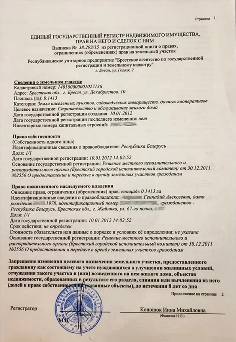 Из выписки стало известно, что он получил этот участок размером 14 соток безвозмездно по решению Брестского горисполкома от 30.12.2011 в пожизненное наследуемое владение. Стоимость аналогичного участка на соседней Железнодорожной улице при этом составляла на момент расследования 912 млн неденоминированных рублей (около 50 тысяч долларов).