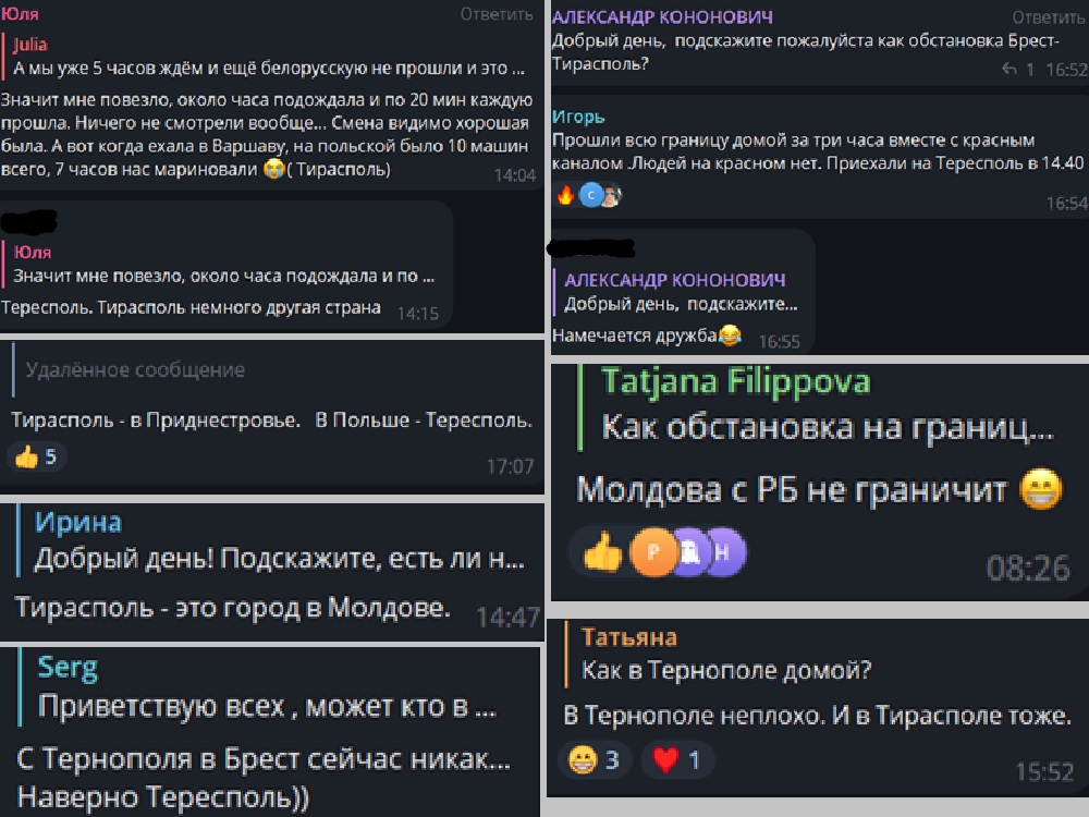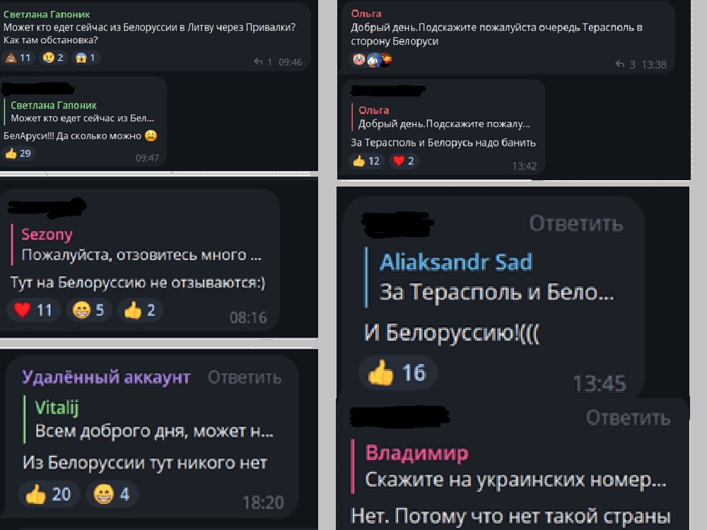 Суммарно в приграничных чатах, которые мы читаем, состоит более 100 тысяч человек. Больше всего там беларусов, россиян и украинцев. Встречаются также поляки и литовцы. Россиян обычно в чатах идентифицировать легко: они неправильно пишут название Беларуси и пункта пропуска «Тересполь».