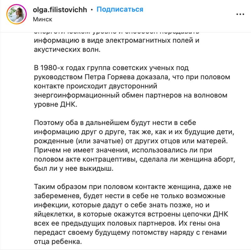Но, возможно, Ольга просто настолько образованный специалист в биологии, что делится передовыми исследованиями? Совсем наоборот. В своих заявлениях она ссылается, например, на Петра Гаряева, чьи концепции о «двустороннем энергоинформационном обмене партнеров на волновом уровне ДНК» признаны антинаучными.
