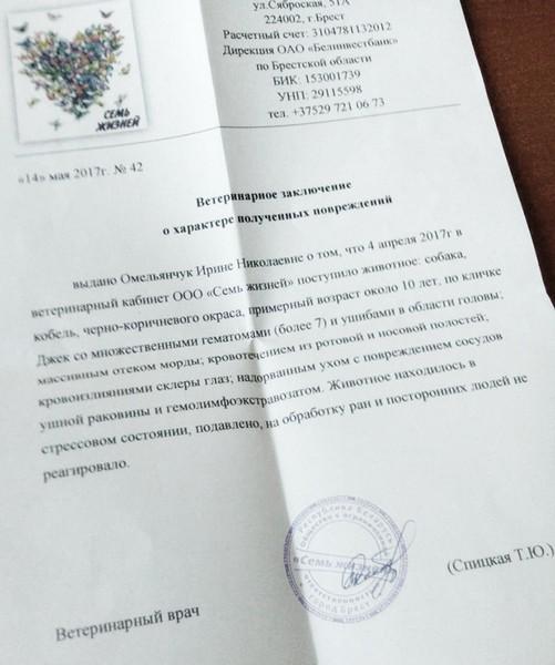 2 мая ей пришел ответ из милиции. В нем говорится, что в результате проверки в действиях избившего собаку мужчины отсутствует состав административного правонарушения, предусмотренного ст. 15.45 Кодекса об административных правонарушениях РБ «Жестокое обращение с животными», так как умысла причинить собаке телесные повреждений у него не было. А бил он ее потому, что пес душил его кур.