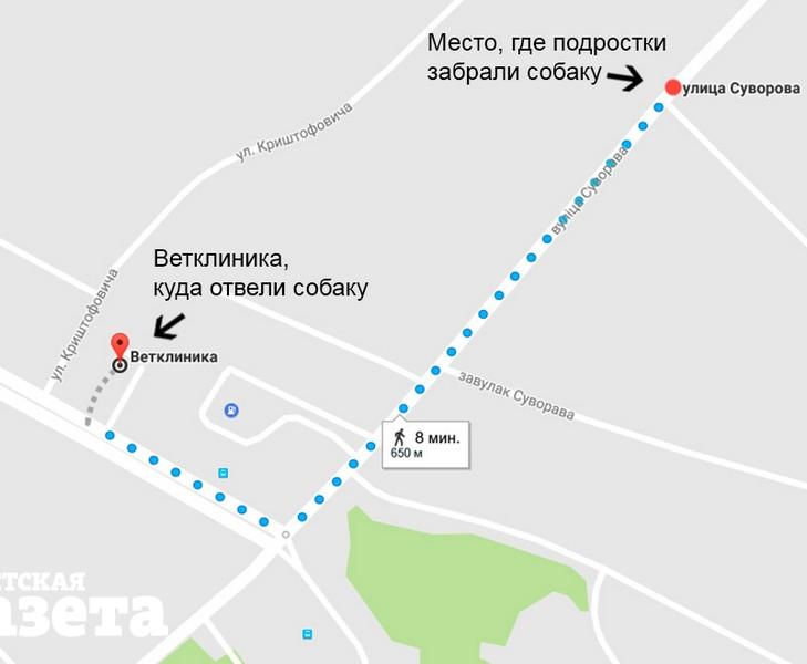 На карте обозначен путь, который прошла избитая собака. Согласно Google Maps, это примерно 650 метров
