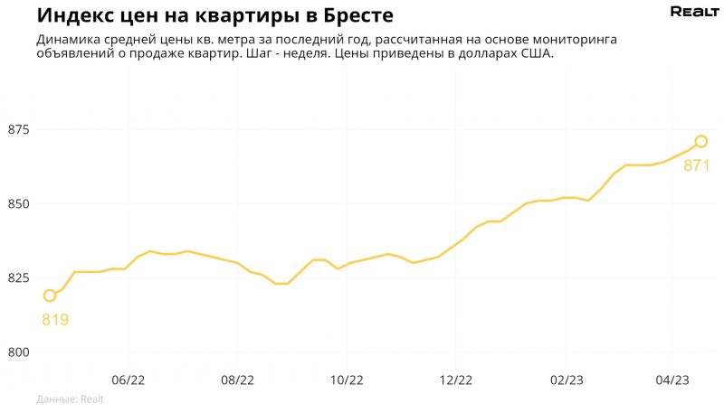 За неделю, с 10 по 17 апреля 2023 года, на рынках жилья крупнейших городов Брестской области произошли некоторые изменения. Средняя цена в объявлениях о продаже квартир в Бресте выросла на 0,3% и составила 871 $/м2, пишет портал Realt.by.