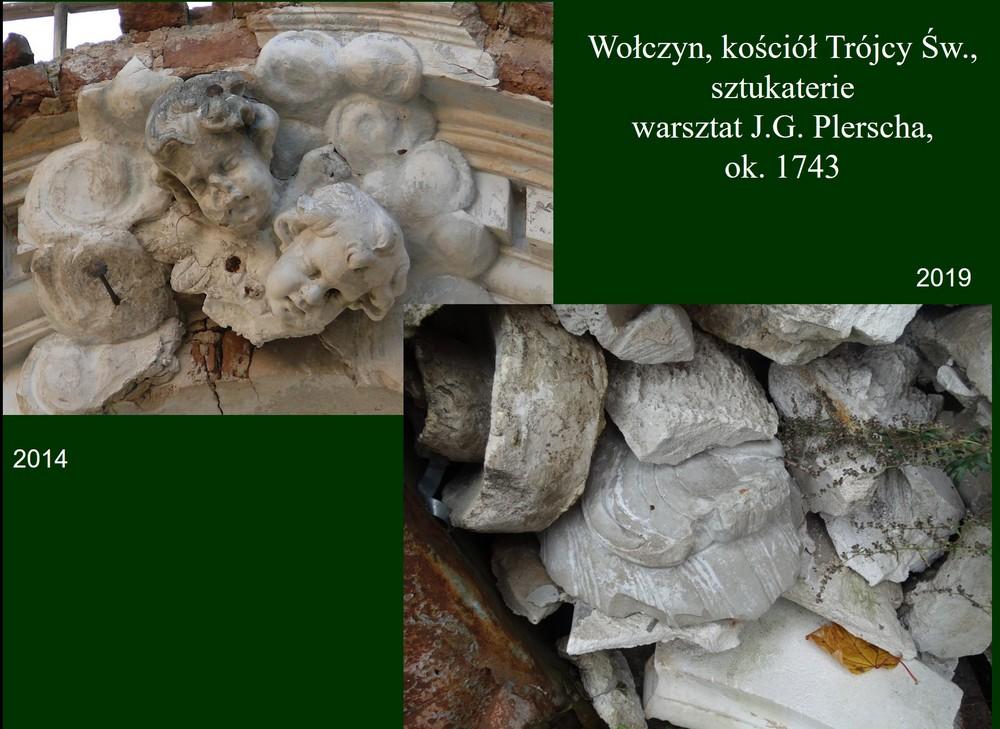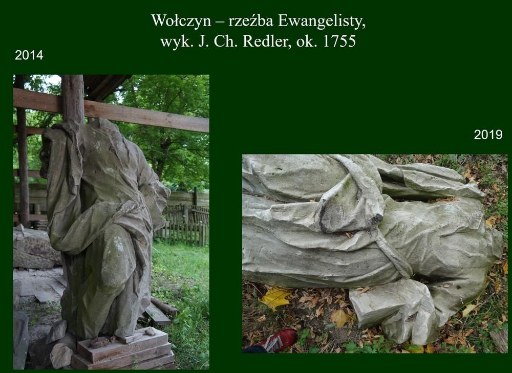 «То, что мы увидели, зовет месть с небес», — считает польский преподаватель истории искусства Мартин Зглинский. — Отличные фасадные украшения, сделанные в мастерской Яна Плерша, полностью сбиты. Их рухнувшие остатки легли в кучу между двумя сараями, где они зарастают мхом и травой. Их заменили грубыми отливами из эпоксидной смолы (или другого материала), которые были прикреплены к фасаду с помощью винтов, грязные торчащие концы которых даже не были замаскированы. Карнизы и профили были реконструированы небрежно. Кабели, торчащие из стен, торчат тут и там. Гипс был заложен плохо, он уже начинает шелушиться. Пластиковые окна не соответствуют первоначальному разделению и совершенно неправильной колористики. Из превосходных скульптур Редлера только один евангелист, после тщательной консервации, стоит на своем первоначальном месте. Скульптура, которая в 2014 году казалась охраняемой и ожидающей консервации, теперь лежит под церковью и врастает в землю. В общем, реликвии абсолютно не защищены, каждый может свободно присваивать фрагменты скульптур или лепнины. Мы не были внутри, но, глядя через стекло в двери (также сделанное ужасно), мы видим, что эффект аналогичен и, возможно, даже более трагичен, чем на фасадах».