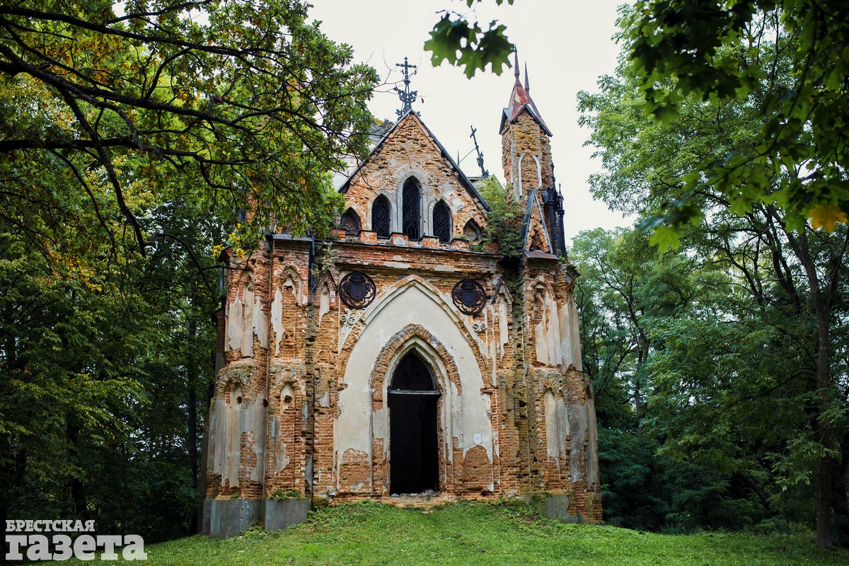 Следующая точка нашего маршрута — деревня Закозель. Здесь сохранилась уникальная каплица рода Ожешко в готическом стиле первой половины XIX века. Сейчас здесь идут реставрационные работы, здание в строительных лесах, но общему восприятию это не мешает. Готическая часовня использовалась как декорация для клипов и профессиональных фотосессий.