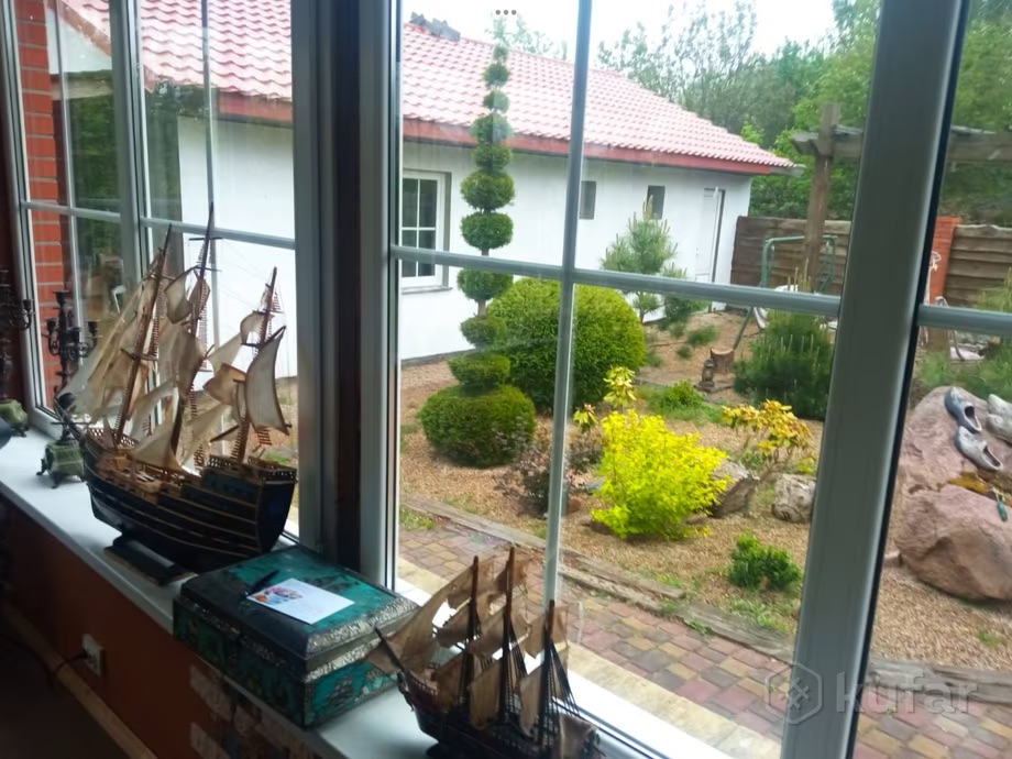 Дом блочный, кровля выполнена из металлочерепицы. Общая площадь – 210 м², а жилая 150 м². На территории в 10,5 соток расположены баня, беседка и искусственный пруд.