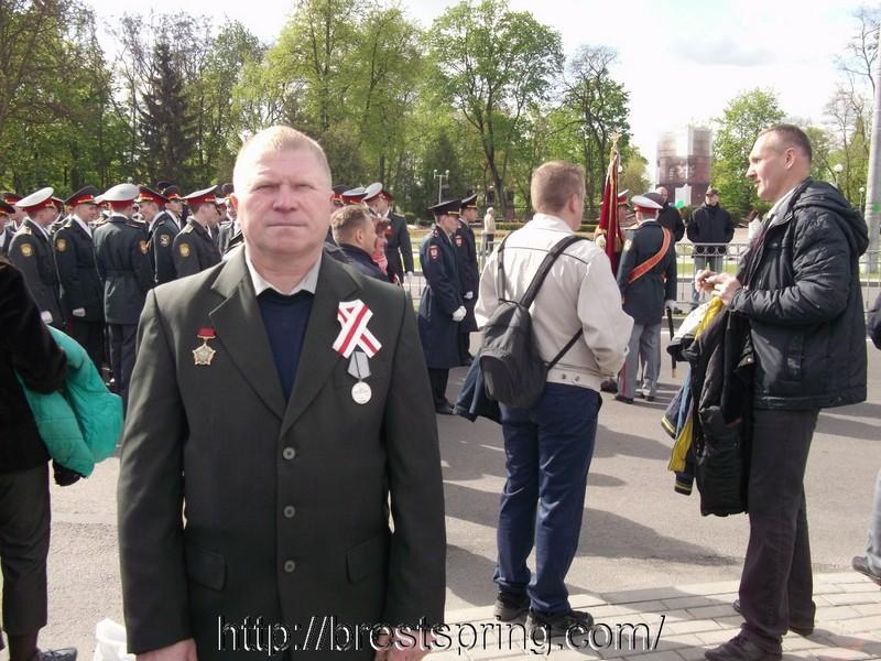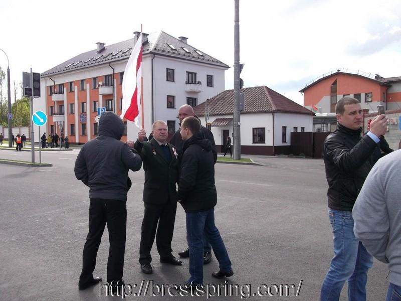 По словам брестского правозащитника Владимира Величкина, 9 Мая ветеран-афганец Александр Сахарук надел костюм с боевой наградой, прикрепил бело-красно-белую ленту на левый лацкан пиджака и пошел на место сбора участников митинга, посвященного Дню Победы, на пересечении улицы Ленина и проспекта Машерова. Когда колонна двинулась в сторону Брестской крепости, он поднял бело-красно-белый флаг и какое-то время шел с ним за «Бессмертным полком».