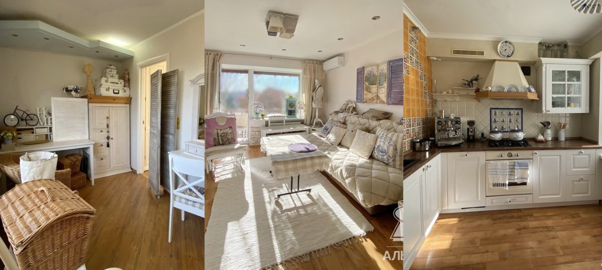 Двухкомнатная квартира расположена на главной пешеходной улице города — Советской. Уютное помещение находится на верхнем этаже четырехэтажного кирпичного дома 1997 года постройки. Первое, что бросается в глаза — наполненное светом пространство. Это достигается благодаря светлым оттенкам стен и мебели. Складывается ощущение, что квартира парит в воздухе.