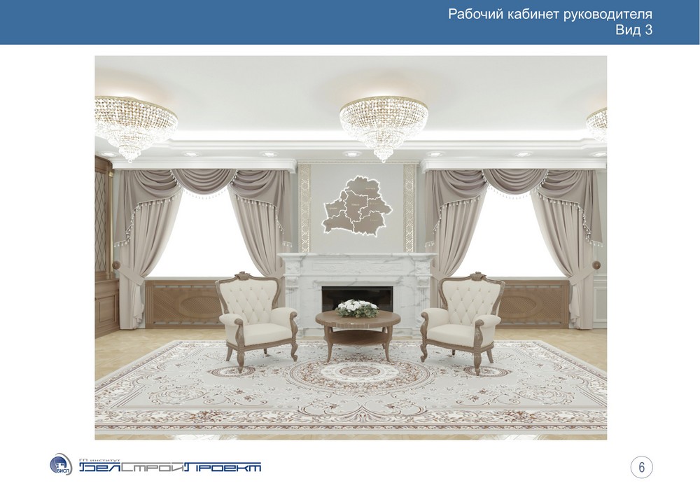 Дизайн-концепция, добытая BELPOL, вероятно, не окончательная: так, в ней есть спортивная и медицинская комнаты «руководителя», вместо которых в позднейшем плане обеденный зал с шестиметровым столом за 16 тысяч рублей.
