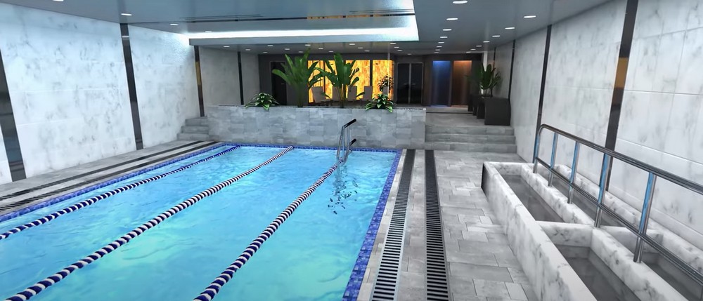 Спа-зона занимает большую часть первого этажа. В ней предусмотрены бассейн (похоже, 25-метровый на две дорожки), две гидромассажные ванны, «дорожка Кнейпа» (линейка ванн для ног с водой разной температуры), криосауна (это как «баня наоборот»: резко охлаждает тело, но не доводит до обмораживания), обычная сауна, хаммам (турецкая баня), «солнечная комната» (солярий с лампами с «полезной частью спектра» солнечного света, чтобы «синхронизировать биоритмы»), джакузи, душевые, снегогенератор, массажные комнаты.