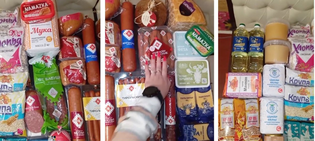 Автор видео называет набор продуктов «подарком» и рассказывает о содержимом другим пользователям: несколько видов масел, крупы, мед, овсяные хлопья, мука, сыры, мясные изделия и намазки на бутерброды.