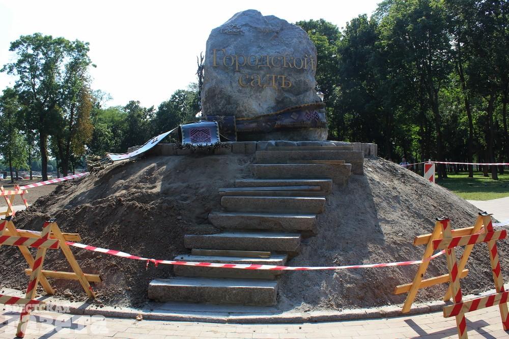 На огромном камне появилась надпись «Городской сад», которая видна издалека. У основания валун опоясан кованым рушником с белорусским орнаментом и летописью Сада.
