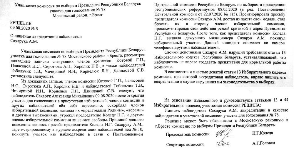 В день выборов 9 августа Александр Сахарук пришел на участок, взяв с собой медали. Однако заслуги перед государством избирательная комиссия проигнорировала и снова указала герою-афганцу на дверь. В знак протеста он бросил награды председателю избиркома под ноги. После этого его лишили аккредитации.