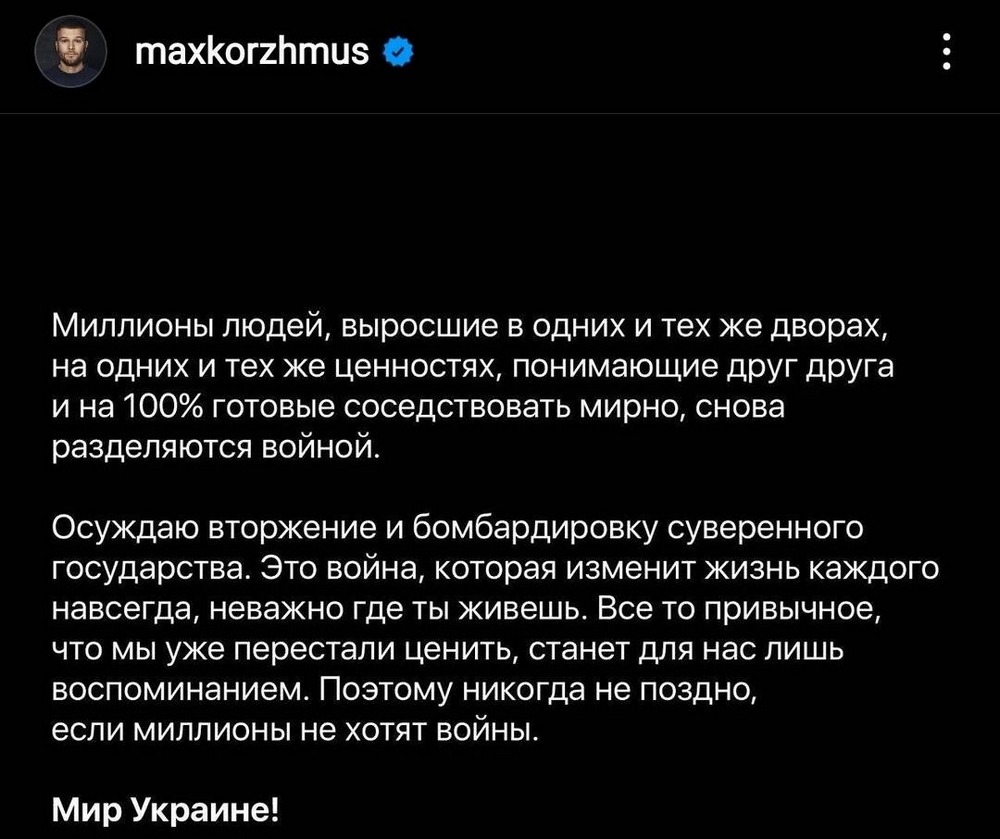 Солидарность с Маргаритой Левчук выказал и Макс Корж. Уроженец Брестчины сейчас проживает в Минске. Ирония в том, что у музыканта были непростые отношения с СБУ (Служба безопасности Украины – прим.ред.). Из-за концертов в Крыму ему сначала запретили выступать в Украине, а в 2017-ом «табу» внезапно сняли. Несмотря на это недопонимание, 24 февраля, Макс Корж опубликовал на своей странице понятную всем запись.