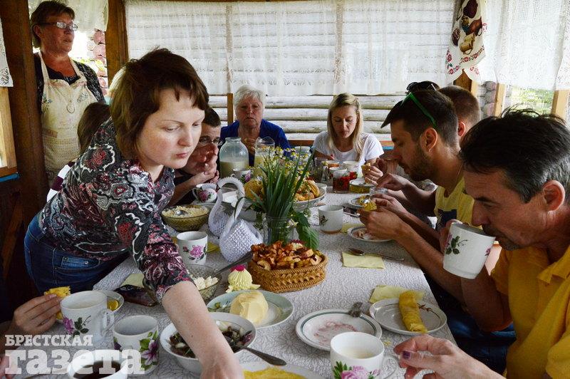 В беседке нас ждут угощения: блины, выпечка, деревенский творог и масло, варенья-соленья, сушеные яблоки, коровье и козье молоко и чай из душицы.