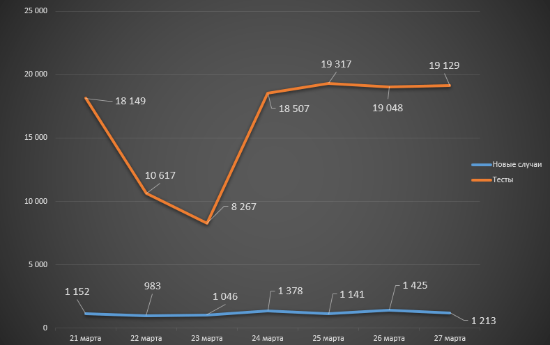 Что касается количества выполненных тестов, то за последние семь дней их число составило 113 034 (на предыдущей неделе – 114 898), а официальная смертность поднялась на 2: неделей ранее официально зафиксирован 61 летальный исход, с 21 по 27 марта – 63. Отметим, что в течение этого времени ежедневно умирали по 9 человек.