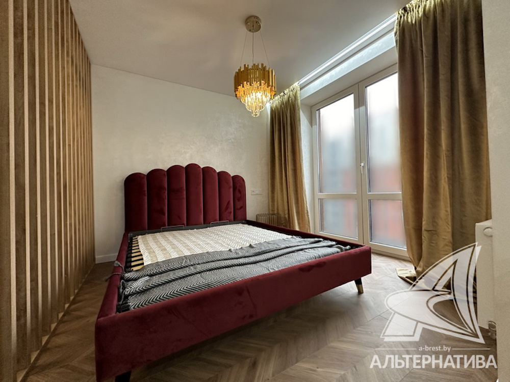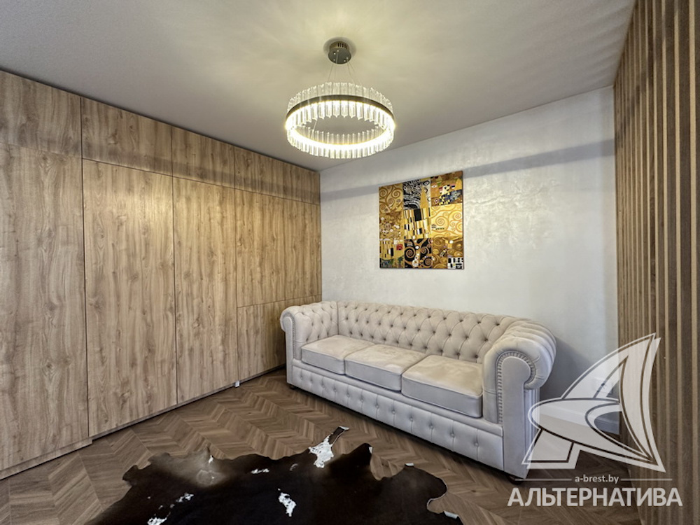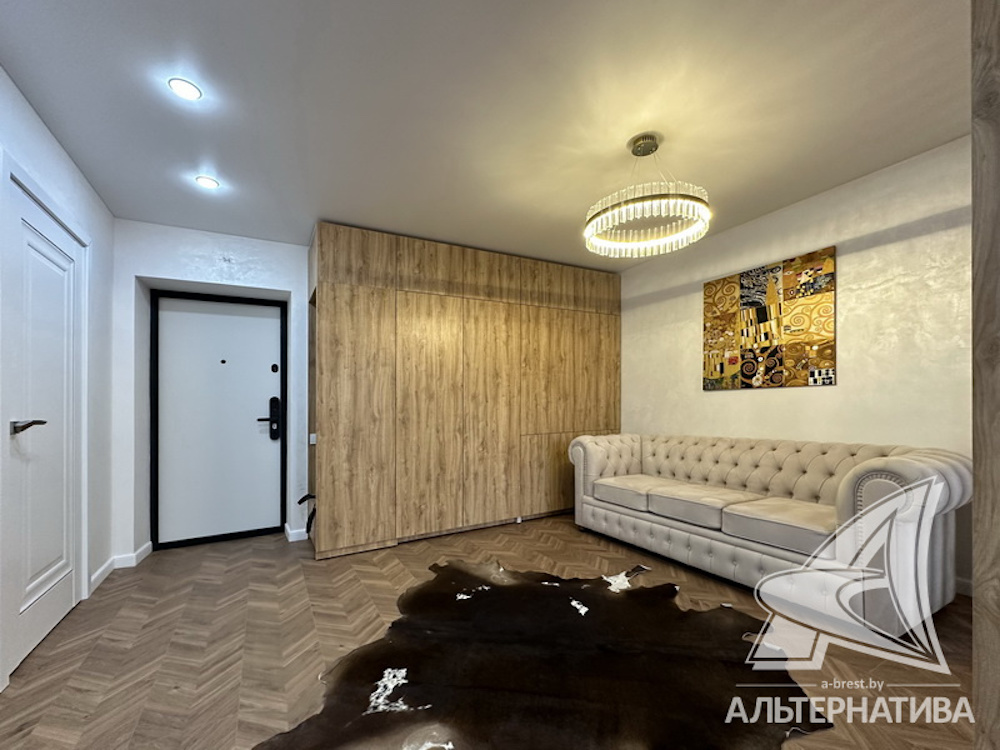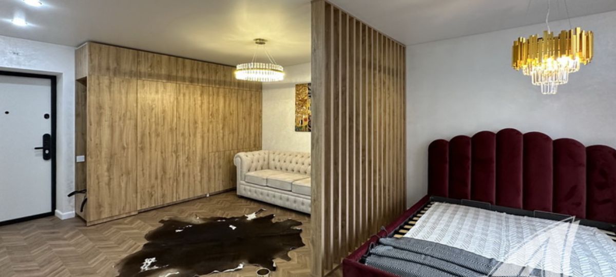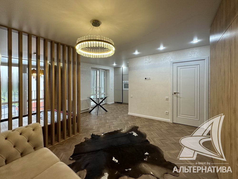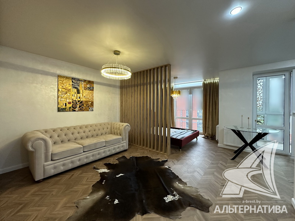 Однокомнатная квартира в Бресте со стильным дизайном интерьера находится в новом доме по улице Гоголя. В ней — одна большая комната, разбитая на зоны: коридор, гостиная, кухня и спальня. Последняя отделена деревянной перегородкой.